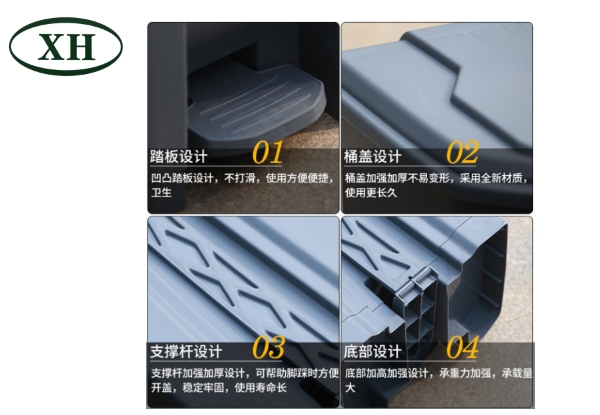 產(chǎn)品介紹腳踩垃圾桶介紹1、密度高的高壓聚乙烯或聚丙稀原材料注塑加工生產(chǎn)制造,使用壽命長(zhǎng)。2、要采用全新升級(jí)原材料,合理避免弱酸性、···